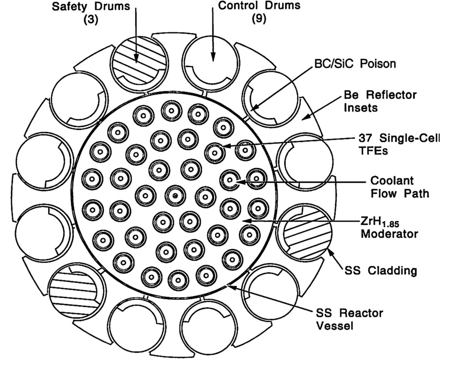 The pins were dispersed in a ZrH1.85 moderator. There were beryllium reflectors and beryllium control drums, each with a 116° strip of boron absorber. They had LiH and stainless steel radiation shielding. The reactors consumed 0.5 g of Cesium per day.