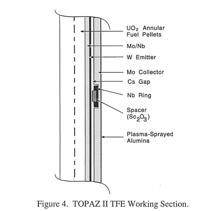 The 115 kWt reactors used 93% enriched annular UO2 fuel elements, which transferred heat through a cesium gap, converting about 5% of the heat to electricity. Outside each pin, they had electromagnetically-pumped liquid metal sodium-potassium eutectic coolant.